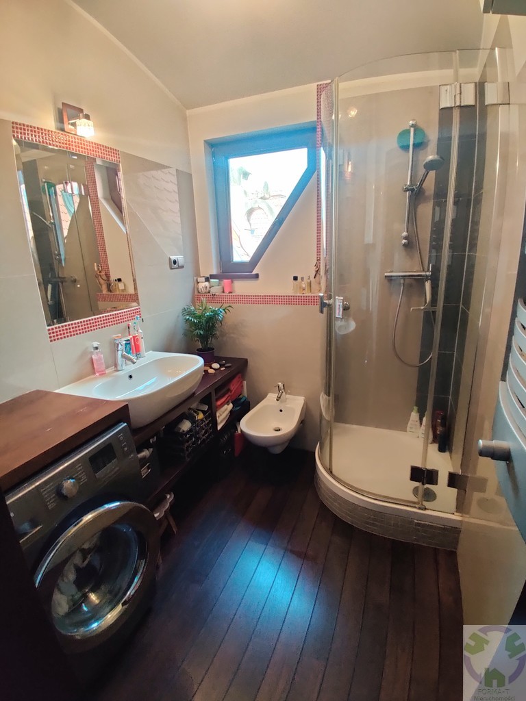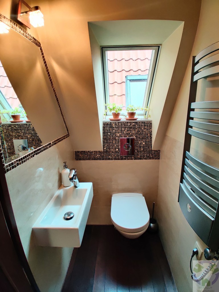 - komfortowa ŁAZIENKA z oknem / pow. ok. 3,5 m2/, w której swobodnie mieści się kabina prysznicowa, umywalka nablatowa, bidet, oraz pralka na podłodze w łazience i w WC, specjalna podłoga z desek, renomowanej firmy.